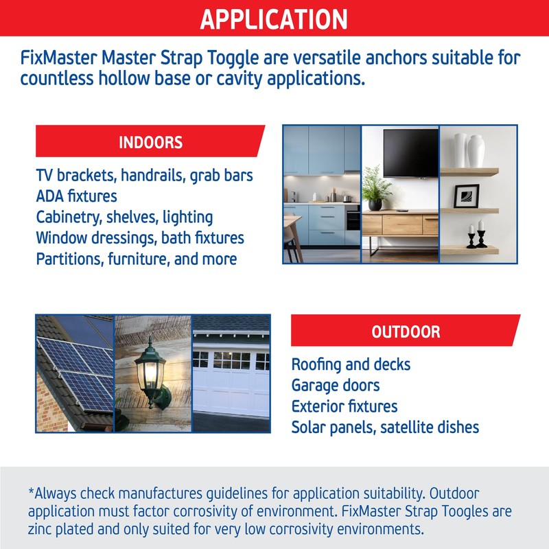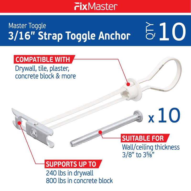 3/16" FixMaster Heavy Duty Master Toggle Bolt Anchor (10 Pack) Zinc Plated w/Screws - 3/16"-24 UNC Zinc-Plated Anchor for Hollow Wall, Plaster & Tile