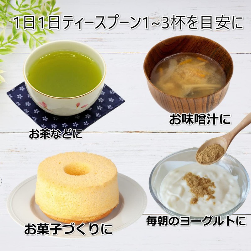 - ✅使用方法:1日ティースプーン1~3杯を目安に。お茶や味噌汁、ヨーグルトなどに混ぜて。