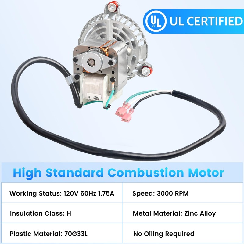 - Combustion Blower Exhaust Fan Motor Technical Specifications---Volts: 120 V, Amps: 0.95 A, Cycles: 60 Hz, RPM: 3000, Shaft Diameter: 5/16", Shaft Length: 1-13/16", Wire Length: 28" with ¼" Female Terminal. 3-Wire Pigtail with ¼" Female Spades. And the 5" combustion blower fan blade is a double-sided impeller.