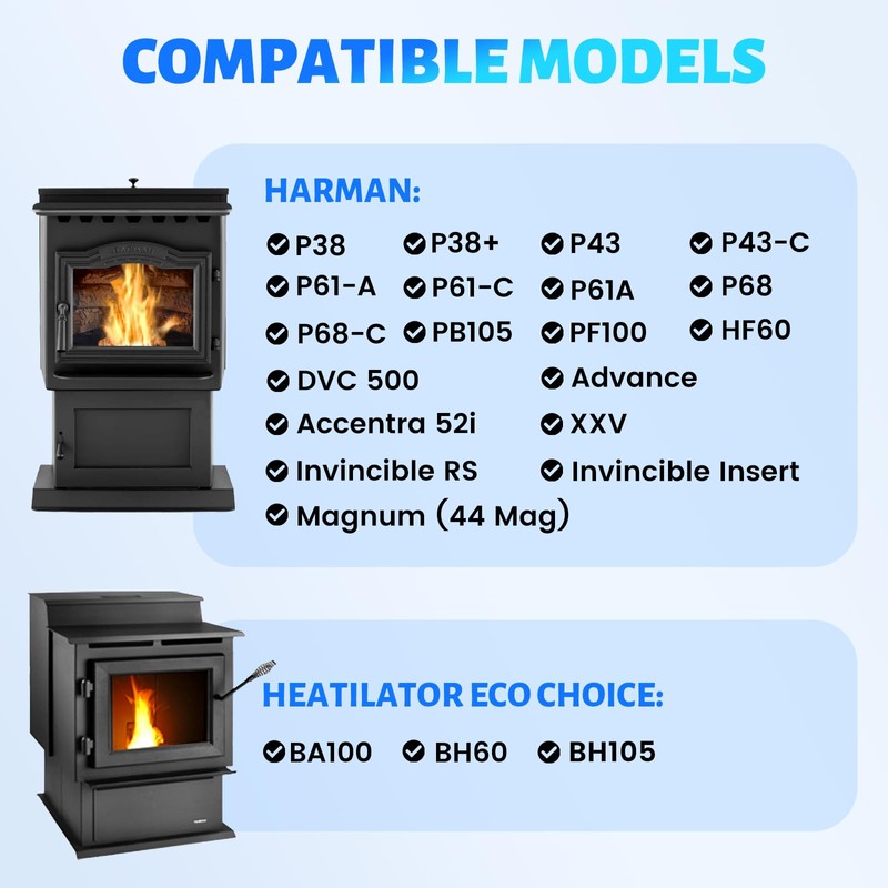 - This combustion motor with fan blade kit fit for Harman Accentra 52i, Advance, DVC 500, HF60, Invincible Insert, Invincible RS, Magnum (44 Mag), P38, P38+, P43, P43-C, P61-A, P61-C, P61A, P68, P68-C, PB105, PF100, XXV pellet stove. Also fit for Heatilator Eco Choice BA100, BH105 and BH60.