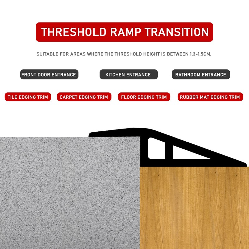 Product Application: Threshold ramp transitions for bathroom doors, bedroom doors, warehouse entrances and kitchen entrances eliminate height differences for seamless transitions and connections. Reduces the risk of tripping due to threshold level differences. Also facilitates easy and convenient passage for floor sweepers and wheelchairs as well.