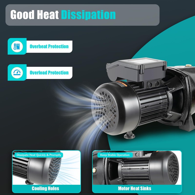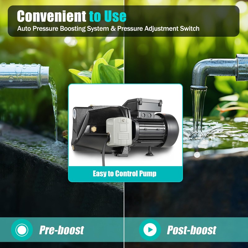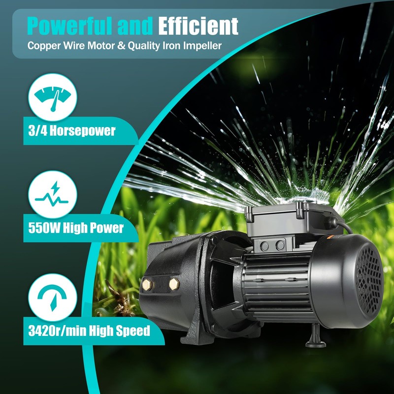 - 【Powerful and Efficient】The pump with a powerful 550W copper wire motor and iron impeller has a high speed of 3420r/min, a 1426.53ft³ hourly flow rate and 183.73ft lift, which can efficiently complete various irrigation tasks in a shorter amount of time. With a water outlet pressure of 5.6 Mpa and a self-suction height of 26.25ft, it is possible to pump water to high-rise buildings.