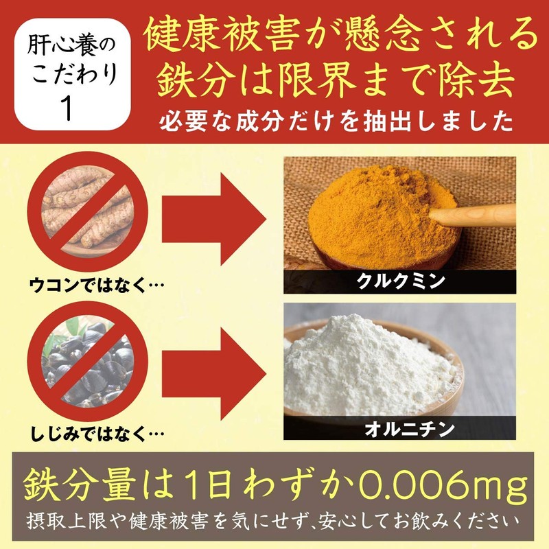 • ✅【特徴1:健康被害が懸念される鉄分を限界まで除去】 鉄分の多いウコンではなく、クルクミンを。鉄分の多いしじみではなく、オルニチンを。重要成分のみを抽出した肝心養の鉄分は、1日わずか0.006mg(肝疾患の場合、1日6mgの鉄制限が推奨されています)。鉄分の摂取上限がある方や、負担を気にされる方でも安心してお召し上がり頂けます。