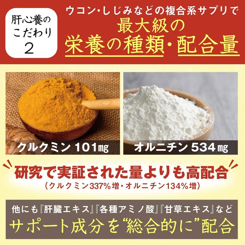• ✅【特徴2:ウコンしじみ複合系サプリで最大級の『配合量と栄養種類』】 研究で報告された配合量よりも多い『クルクミン101.7mg+オルニチン534mg(1日分)』を実現。加えて『ヘパでお馴染みの肝臓エキス』『ミルクシスル』『甘草エキス』『ビタミンB1』『各種アミノ酸(グリシン シスチン アラニン グルタミン)』など、サポート成分を総合的に配合しています。