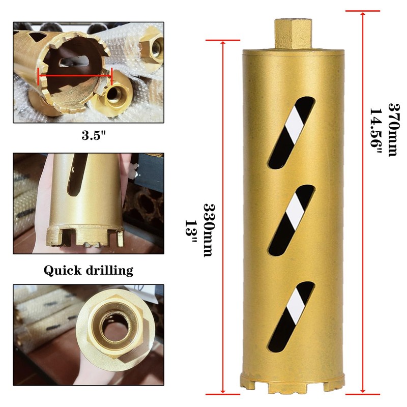 - Dry Drill Core Bits for Professionals: diamond core drill bit with 3.5 inch (89mm) diameter and 14.56in/370mm total length.