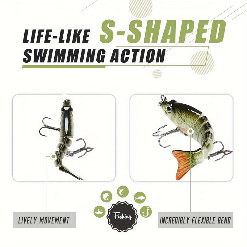 - Sound-Activating Joint System: Colliding joints create bell-like distress sounds underwater. Attracts predatory strikes from bass, walleye & saltwater fish as topwater lures or jerk baits