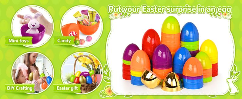 Bigger and Heavier Than Regular Easter Eggs.Bigger enought to keep all kinds of easter stuffers and party surprises.Higher Quality. Made of Hard Polypropylene Thick Plastic.