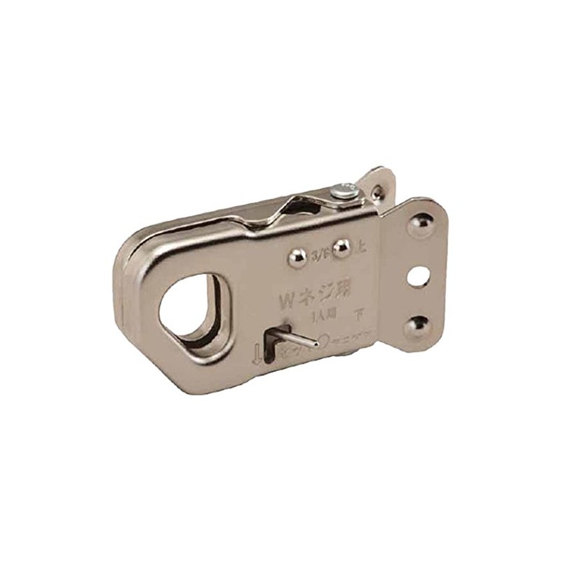 Small type for 3-minute screws (W3/8); Double safety lock type with set lever; Can be installed with one hand; Small and lightweight 11.8 oz (350 g); Used as a safety belt mounting for preventing fall; Installs on all screw bolts embedded in concrete ceilings and mounting safety belt hooks; Plumbers, electricians, aircrafts, interior works; Width: 4.5 inches (115 mm). Height: 2.3 inches (59 mm) Thickness: 1.4 inches (36 mm); Number of ropes (contractors); Tensile strength: W3/8 (24.7 kN) (in-house testing in accordance with the Ministry of Health, Labor and Welfare Standard 11.5 kN); Compatible with all screw bolts. Steel plate (SPCC2.3t); Steel
