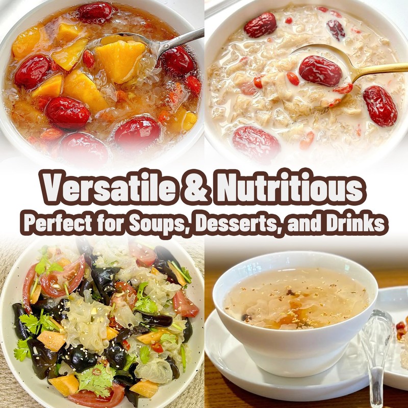 - Great for Asian Soups: Commonly used in Chinese cooking, snow fungus pairs well with goji berries, red dates, and lily bulbs. Add it to soups or broths for a mild taste and soft texture—great for simple, cozy meals at home.