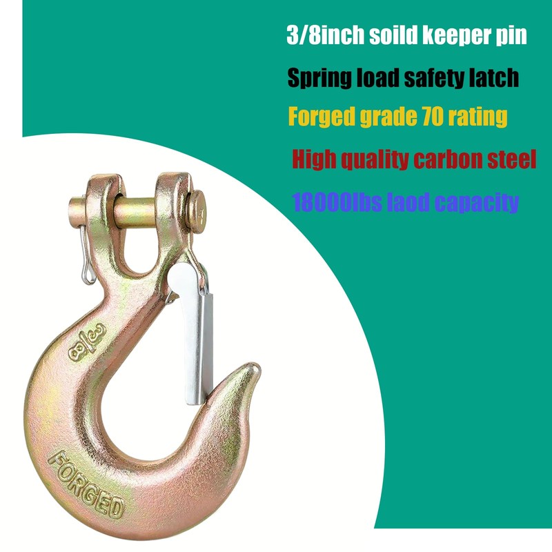 - 4PCS 3/8" G70 CLEVIS SLIP HOOK: There is 4pcs 3/8" G70 safety slip hook which provides good performance for connecting safety chains or transport binder chain; It resist rain, dirt, snow, mud and other corrosive elements, suitable for any weather conditions
