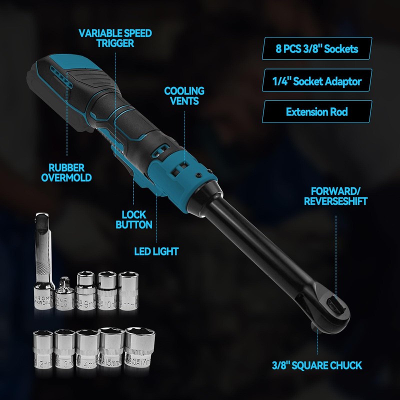 - Package Includes: 1 x Electric Ratchet Wrench, 8 x metric sockets(9mm/10mm/11mm/12mm/13mm/14mm/15mm/17mm), 1 x extension rod (3/8" x 3"), and 1 x drive adapter (3/8" to 1/4")