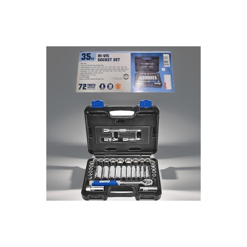- - 🔩 Constructed from durable chrome vanadium steel for long-lasting strength and reliability - ⚙️ 72-tooth quick-release ratchet with a 5° arc swing for precision and ease of use - 🧤 Comfort grip handle enhances user control and comfort during operation - 🎯 Color-coded sockets with high-visibility markings ensure fast and accurate identification - 📐 Includes both SAE and Metric sizes for versatile application across various tasks - 🧳 Heavy-duty blow-molded case keeps tools organized and protecte