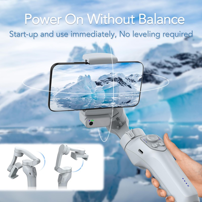 • 【No Leveling Required, Multiple Angle Shots】Designed with beginners in mind, this stabilizer makes mounting and shooting a breeze, eliminating the need for complicated horizontal adjustments. Simply clip your phone in the center and you're ready to go!One of the standout features of the cell phone gimbal stabilizer is its ability to provide rich extreme angle shooting.Whether you're capturing breathtaking landscapes or dynamic action shots,this iphone gimbal stabilizer for video takes your content to new heights and capture every moment from unique perspectives.