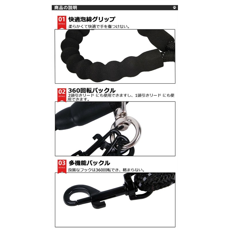 - 安全設計: 滑り止め加工が施されており、手からリードが滑り落ちる心配がありません。