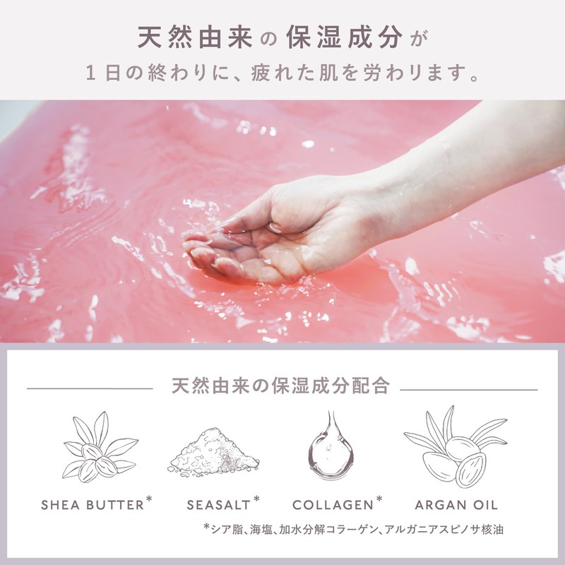 - 天然由来の保湿成分(シア油、海塩、加水分解コラーゲン、アルガニアスピノサ核油)配合。お湯に溶かすとやさしく発泡し、ほんのり色味のついた「にごり湯」になります