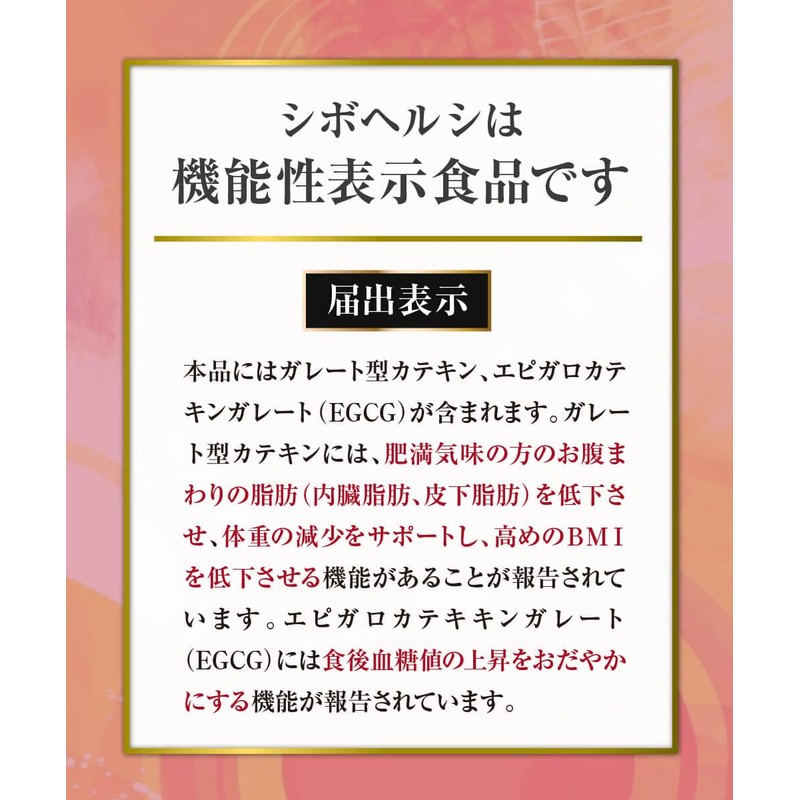 - 【シボヘルシ】本品にはガレート型カテキン、エピガロカテキンガレート(EGCG)が含まれます。ガレート型カテキンには、肥満気味の方のお腹まわりの脂肪(内臓脂肪、皮下脂肪)を低下させ、体重の減少をサポートし、高めのBMIを低下させる機能があることが報告されています。エピガロカテキンガレート(EGCG)には食後血糖値の上昇をおだやかにする機能が報告されています。