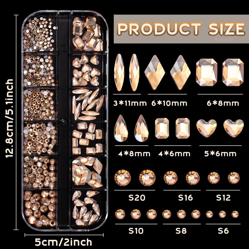 - Gold Rhinestones Gems: Typical round rhinestones are assorted in 5 sizes(S6/S8/S10/S12/S16/S20), Champagne gold rhinestones have 6 shapes nail gems, like heart, diamond, rhombus, oval, melon seed, water drop etc. This rhinestones kit makes it easy for you to make any nail art you like, and will bedazzle your acrylic nails