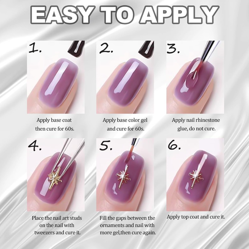 - Easy to use: Just clean the surface of the nails, put the nail studs on the nails with nail rhinestone glue, then apply a layer of top coat for nails and cure, which is very simple and suitable for professionals and beginners.