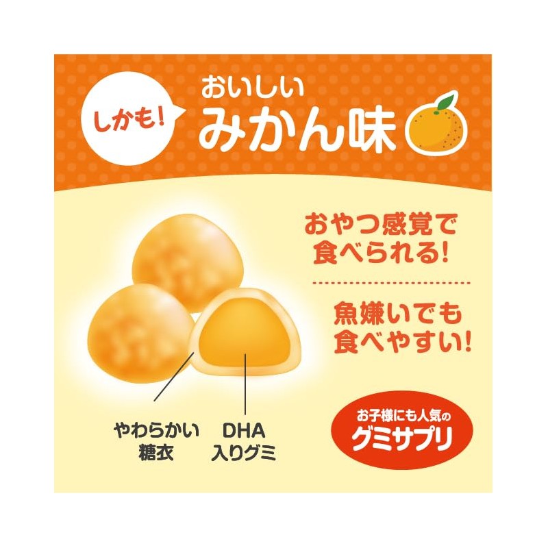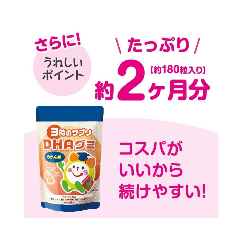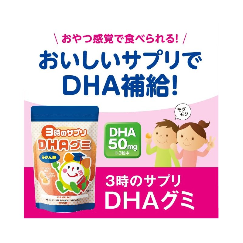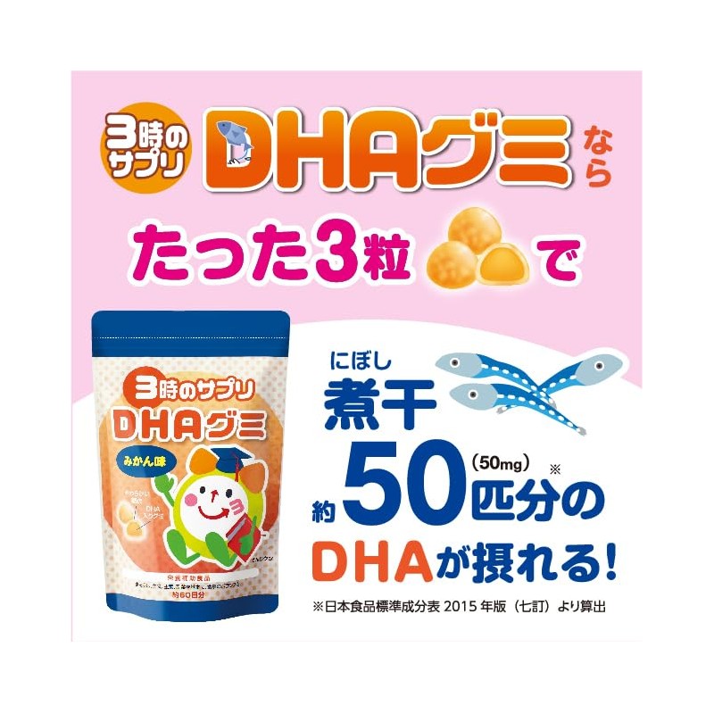 • 「3時のサプリ DHAグミ」は、3粒でDHAが50mg摂れるみかん風味のグミです。