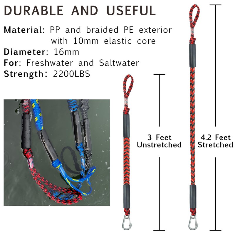 - 5.Package included:Includes 2 Pack Dock Ropes Which Stretches Up From 3 Feet To 4.2 Feet.Ropes Stronger Than You Think: Bungee Dock Lines With Tensile Strength Of 1900lbs. Recommended For Docking Boats And Pwc'S Up To 3000lbs.If There Are Quality Problems, We Will Replace It For You.