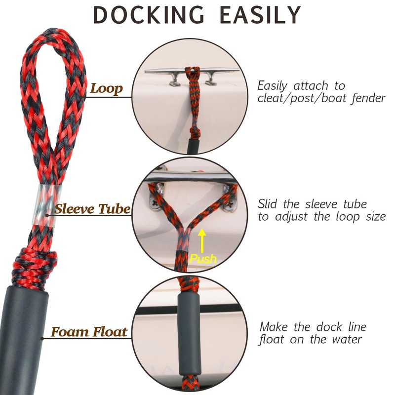 - 3.Built-In 10mm Elastic Core:The Dock Line Has A 10mm Elastic Core Inside And A Polyethylene Braided Rope Outside, With Triple Stitching Reinforcement At The Ends Of The Loop. This Design Effectively Dampens Shock And Absorbs Impact On Pwcs, Small Boats,Cleats And Docks, Making The Dock Line More Durable And Strong.Suitable For All Motorized And Non-Motorized Pwc,As Well As Small Boats