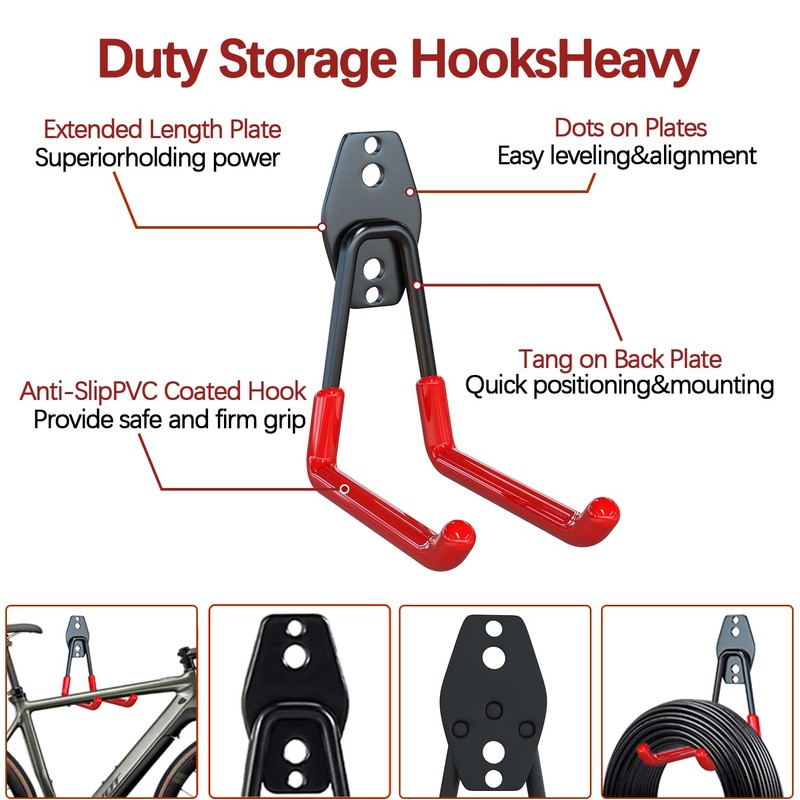 • Easy To Install: These garage hanging hooks are suitable for various walls. You can install them effortlessly. For plaster walls: (1) Insert black expansion screws into the two large holes of the heavy duty garage hooks; (2) Low speed drilling or manual tightening of steel screws. For wooden/brick/concrete walls: (1) Mark the two small holes for the garage hangers on the wall; (2) Drill holes and insert white expansion pipes; (3) Drill in steel screws