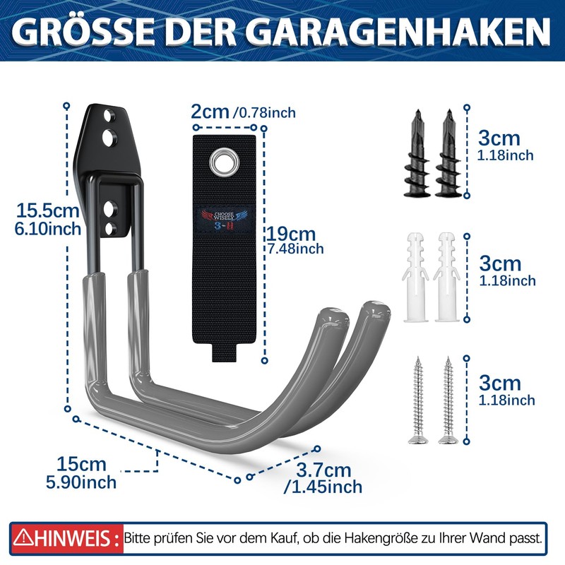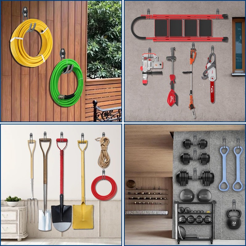- Multifunction heavy duty hook: the garage hook contains 4 large J cable hooks and 1 Velcro straps. 3-H garage wall hooks are available for all your garage organisation needs. You can hang garden tools from different types and sizes as needed and get efficient storage space while eliminating clutter