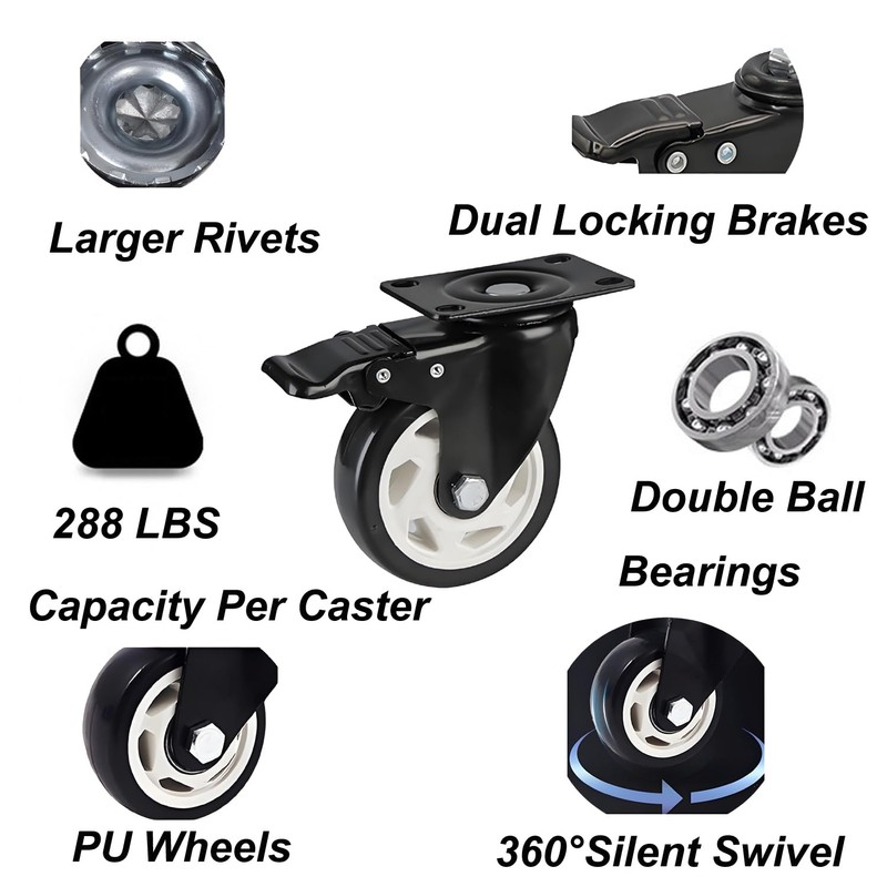 • 【1150 LBS Industrial Strength】287.5LBS per Caster (1150LBS total),Overload-Tested PU Wheels + Steel Core, Warehouse Ready:Move Pallet Racks or Heavy Machinery, And Each Wheel Tested to 150% Capacity
