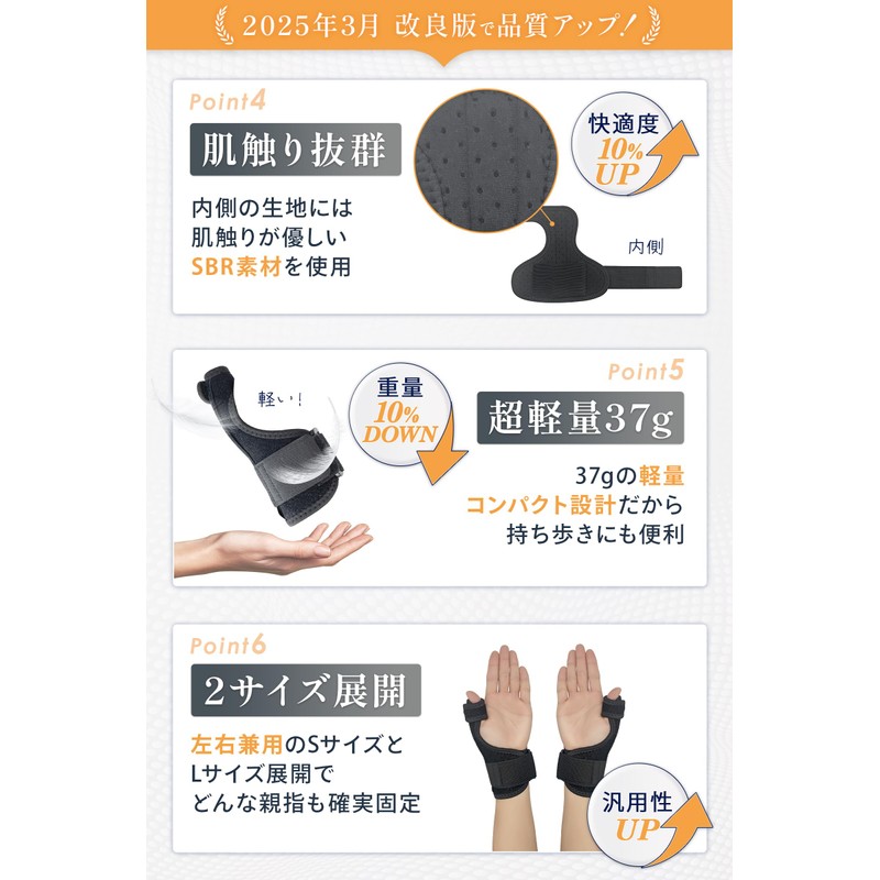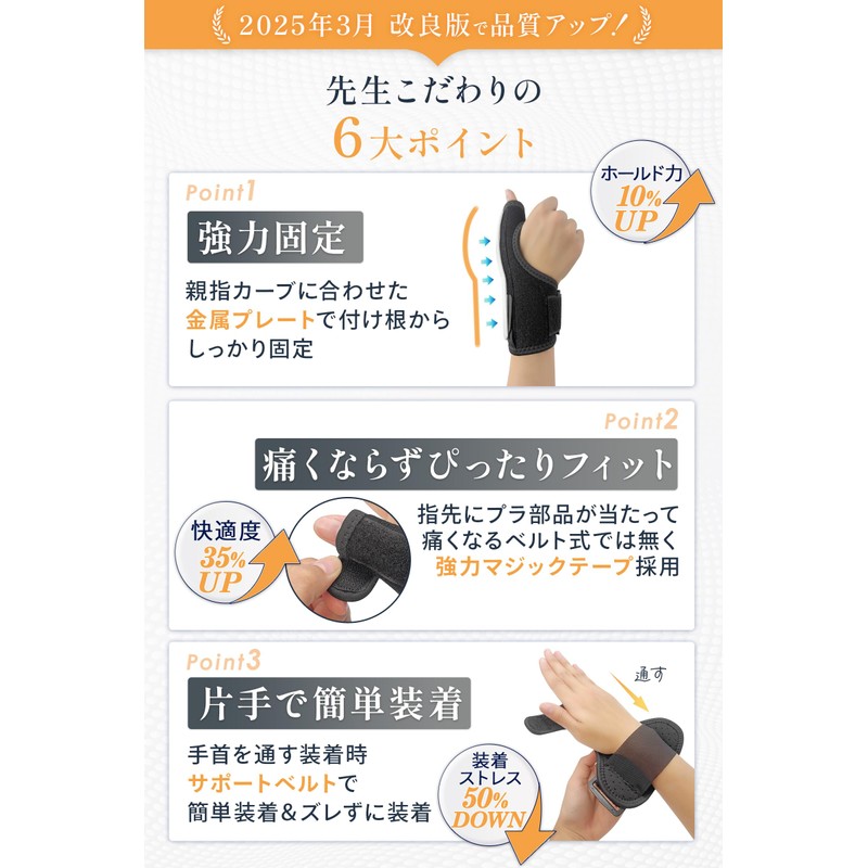 - 【改良版】お客様の声から「指先が痛くならない」「しっかり固定」のサポーターへ!①親指カーブの金属プレートでホールド力10%UP、②親指にプラ部品不使用で快適度35%UP、③装着時サポートベルトで装着ストレス50%DOWN、④SBR素材を使用で快適度10%UP、⑤軽量コンパクト設計で重量10%DOWN、⑥どんな親指も確実固定で汎用性UP、に大改良しました。