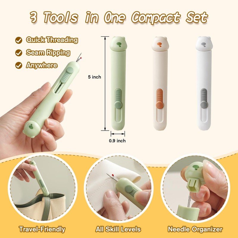 Say goodbye to the frustration of traditional threading and seam ripping! Our upgraded 3-in-1 automatic needle threader + seam ripper + tailor needle storage box tool set is designed for hand sewing and embroidery needs. With a double-head design, you can easily switch between threading and seam ripping with just a light press, and the tailor needles can be easily stored to prevent loss. Made with durable steel wire and featuring a retractable, portable body, this tool simplifies your sewing process while being easy to store and carry. Whether you're fixing clothes, working on detailed embroidery, or teaching sewing to a beginner, this is the essential sewing tool every kit needs. Perfect for use with denim, cotton, silk, canvas, and more, it makes sewing tasks quicker, safer, and more enjoyable.