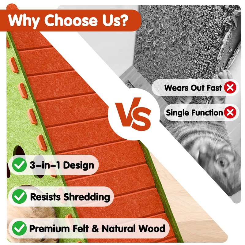 - Felt and Wood Material: Available in both high-quality felt and sturdy wood options, this l shaped cat scratcher is built to withstand everyday use while resisting shedding and debris. The felt triangle cat scratching board keeps your home clean from loose fibers, while the wood cat post scratcher adds durability and elegance, ensuring a long-lasting solution for your cat's scratching needs.