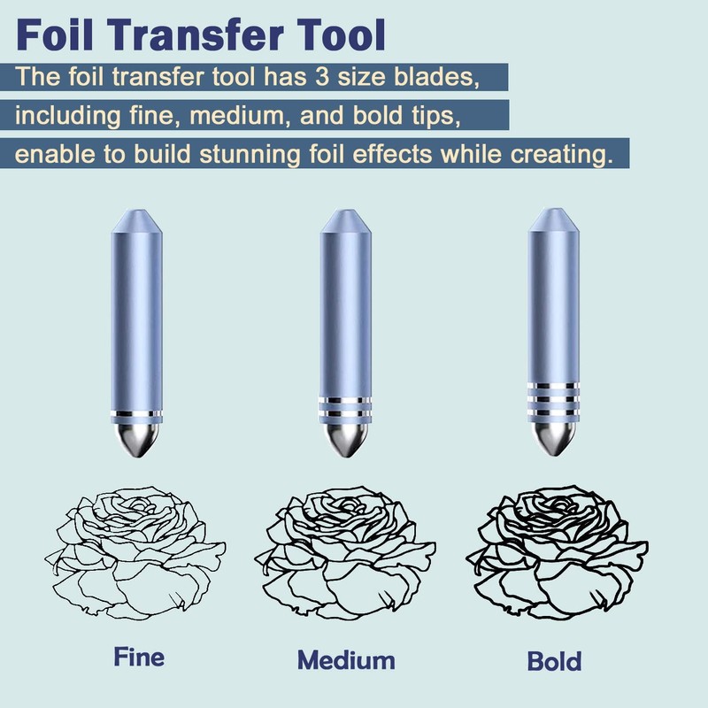 The foil transfer kit comes with a housing and 3 different sizes blades, including fine, medium, and bold tips, enabling you to built stunning foil effects while creating.
