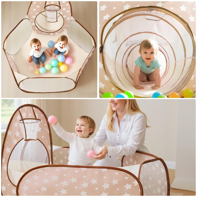 • Multi-Functional Play Set: This 3-in-1 kids play tent combines a spacious play tent, a crawl tunnel, and a fun ball pit. Each component can be used individually or connected together to create a variety of play experiences