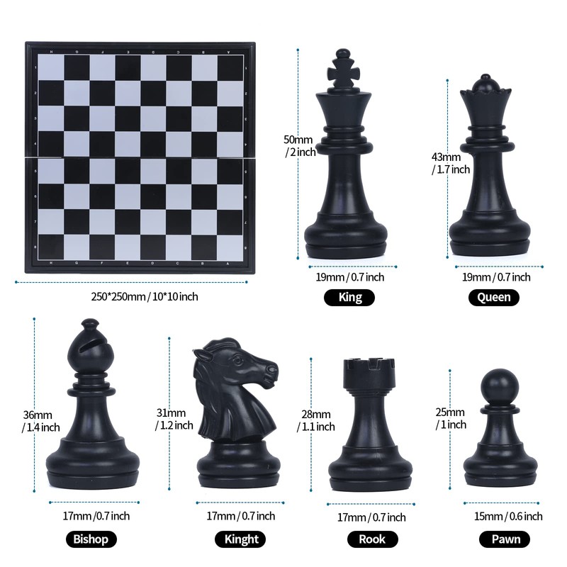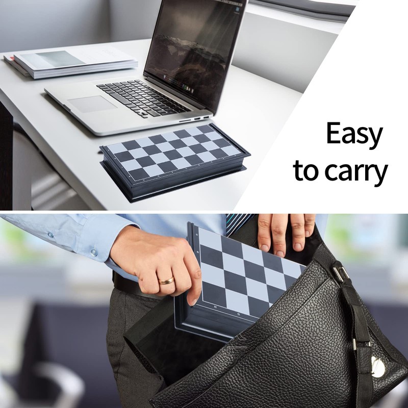 - Portable chess: chess game foldable design for collecting chess pieces. Extended dimensions: 25 x 25 x 2 cm, closed size: 25 x 12.5 x 4 cm. The perfect size for playing on the go or in bed. It is large and portable enough for accurate gripping and placement.