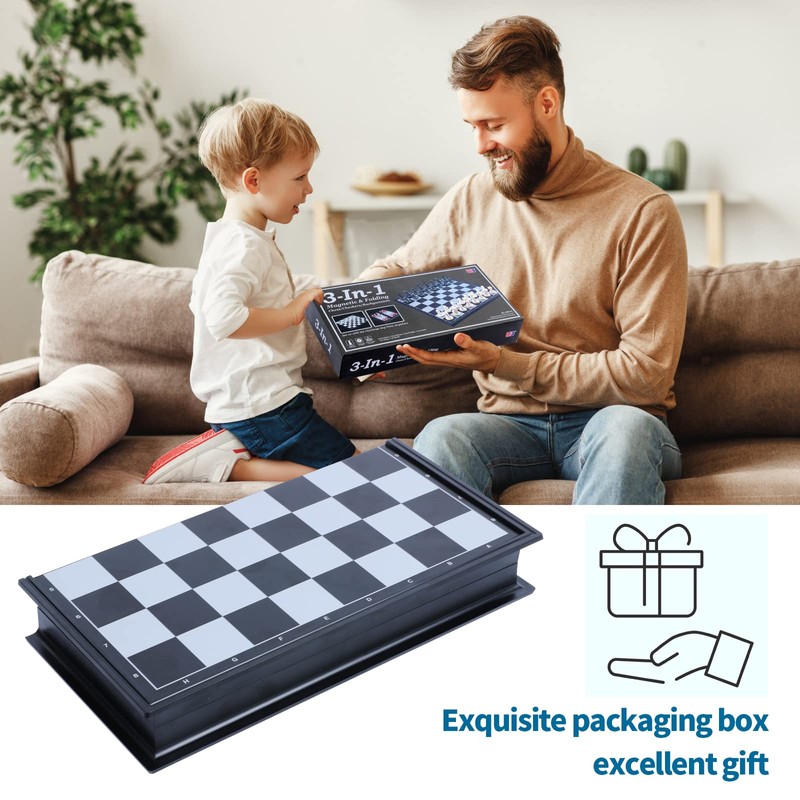 3-in-1 Magnetic Chess Game, FISHOAKY Chess/Lady/Backgammon Travel Set, Foldable Chess Board, Black and White, 25 × 25 cm, for Children, Adults, Family, Christmas, New Year