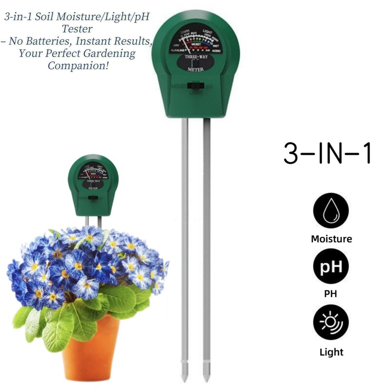 soil meter 3in1 【3-in-1 Moisture Meter】This 3-in-1 soil moisture meter measures soil moisture, pH level, and sunlight intensity in one convenient tool. Perfect for plant lovers, home gardeners, and indoor or outdoor plant care 【No Battery Needed】Simply insert the probe into the soil to get instant readings. No batteries or power required. This plant water meter is ideal for houseplants, potted plants, and garden use. Note: If the soil is too dry, you need to water the soil to measure the value 【Accurate & Instant】Built with premium dual-needle detection technology, this plant moisture meter for houseplants delivers quick, precise readings, making plant care easier and more effective 【Durable & Portable】Plant moisture/ PH/ light meter is compact, lightweight, and built to last. Take moisture meter for plants with you anywhere your plants grow! 【Widely Use】Perfect for indoor plants, bonsai, potted flowers, lawns, farms, and greenhouses. A reliable soil moisture meter indoor plants can trust for accurate watering guidance. A must-have tool for home gardeners and plant lovers