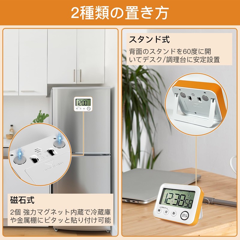 - Flexible for multiple installations: There are 2 ways to install it, magnetic type and stand. 1. The high-strength magnet on the back allows for speed adsorption to the refrigerator or metal shelf, and can be installed with just one touch while working in the kitchen. 2. Open the 60° adjustable stand to ensure a natural viewing angle on your desk or workbench. Whether you place it on your bedside as a reading timer, or as a progress tool in your workspace, you can choose the best placement for your life The lightweight design makes it easy to move around and takes up much space