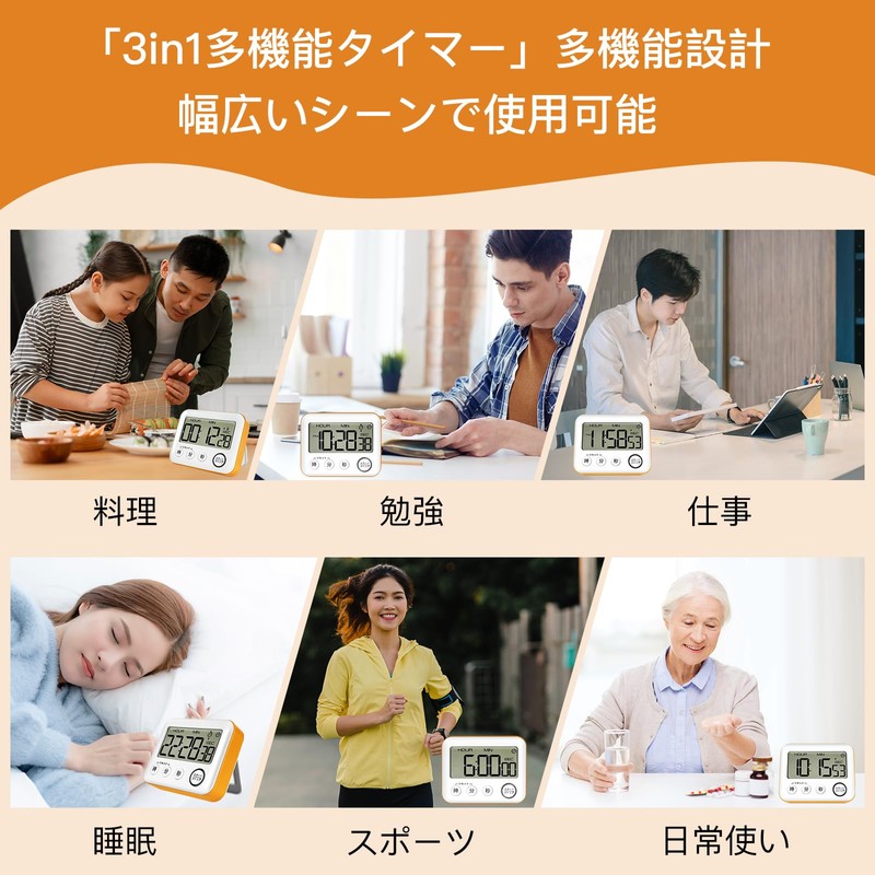 3-in-1 Multi-Function Timer, Large Screen Display, 12/24 Hour Digital Clock, Kitchen Alarm, Magnetic and Stand Installation, Silent Light/Sound Alarm Switching, For Study, Kitchen, Sports (Orange)