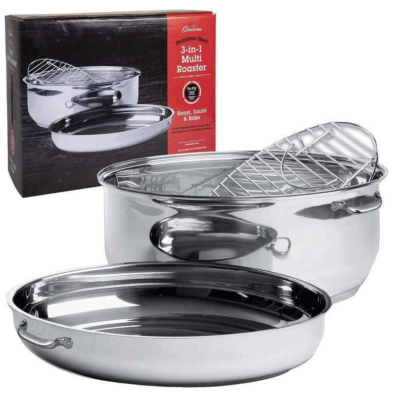 Camerons 3 In 1 Multi Roaster- Tri-ply 18/10 Professional Grade Stainless Steel- 11qt Poultry Roasting Pan, Stock Pot, Sautee Cookware & Lid-Induction Capable w Stick Resistant Interior