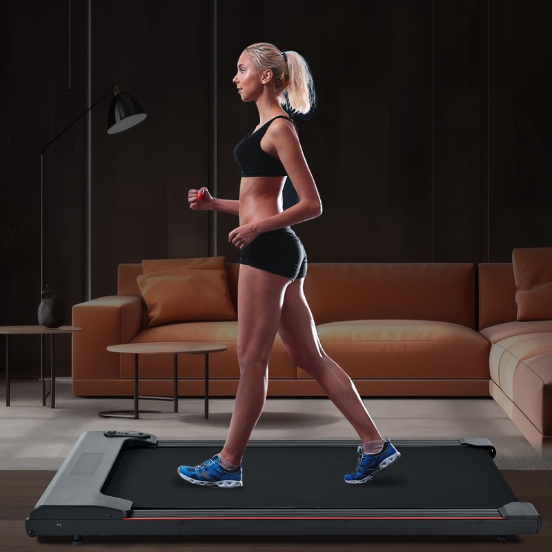 - 【Convenient Compact Treadmill】The treadmill boasts a sleek and space-saving design, just 4.6 inches thick. Equipped with built-in wheels, this mini walking pad offers effortless portability, allowing you to move it around with ease. Once you've finished your workout, simply slide it under your desk, bed, or sofa for convenient storage.