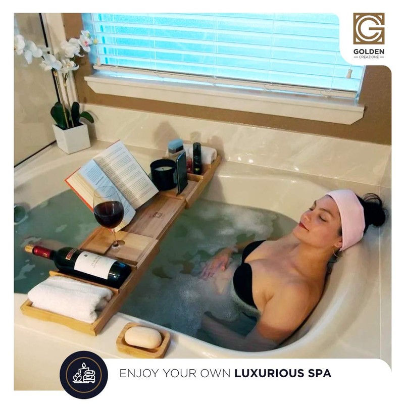 - ☀ ENJOY YOUR OWN LUXURIOUS SPA. Relax at home with this 42.9" water repellent bamboo bath tray that fits most bathtubs and gets strongly secured with its anti-slip pads. Get your wine, tablet, candles, and beauty products to transform your bathroom into magic. Includes a FREE Soap Holder Plate valued at 6 dollars.