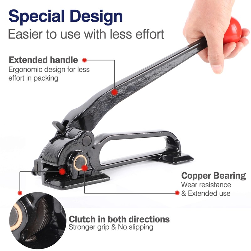 - Labor-Saving and Easy-to-Use: Ergonomic design on manual tools' handle with non-slip, comfortable rubber cover. The easy-to-turn handle makes the strapping’s tensioning, crimping & sealing and cutting action fast and agile