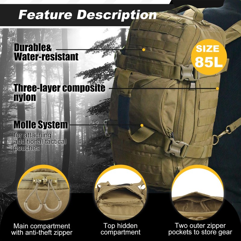 3 In 1 Tactical 85L Military Backpack Travel Duffle Bag for Weekender Gym Workout Deployment