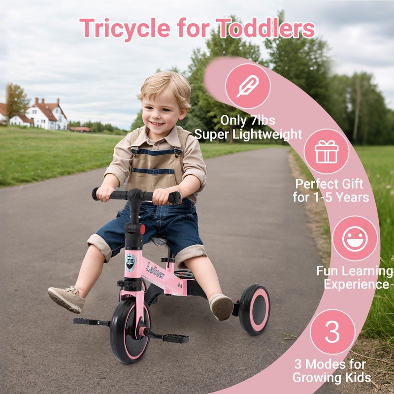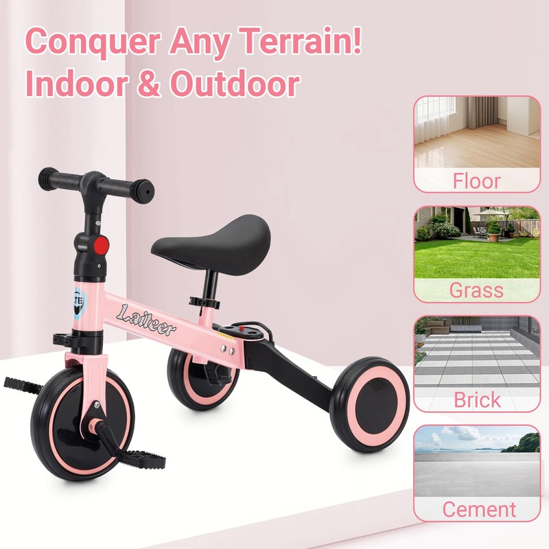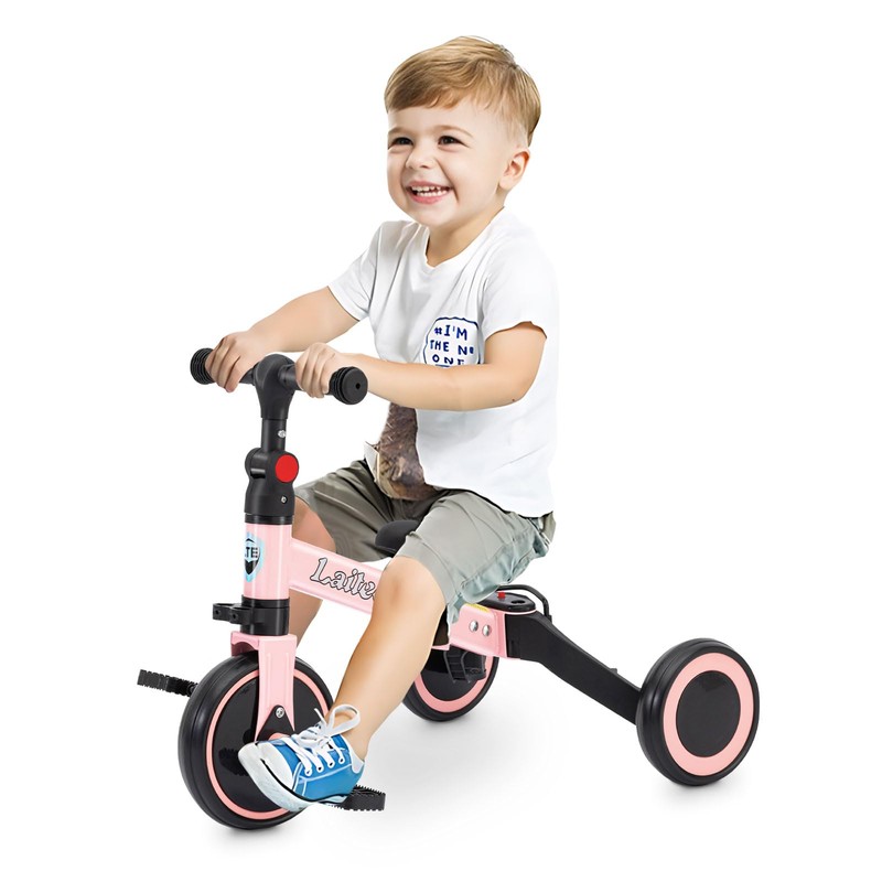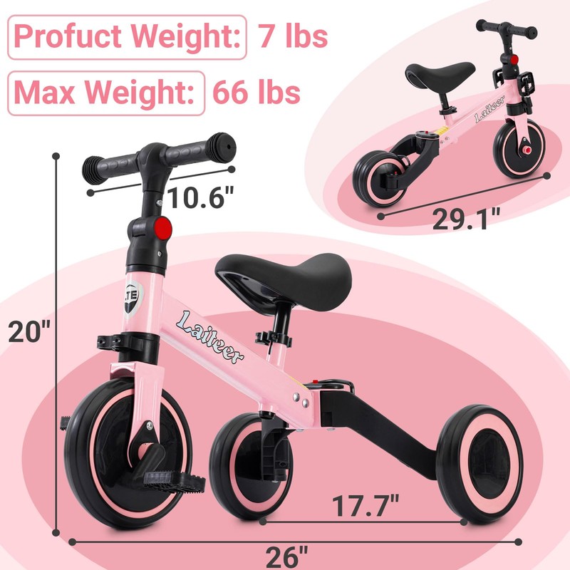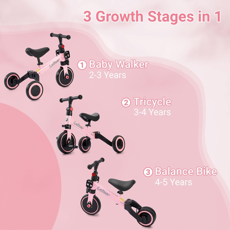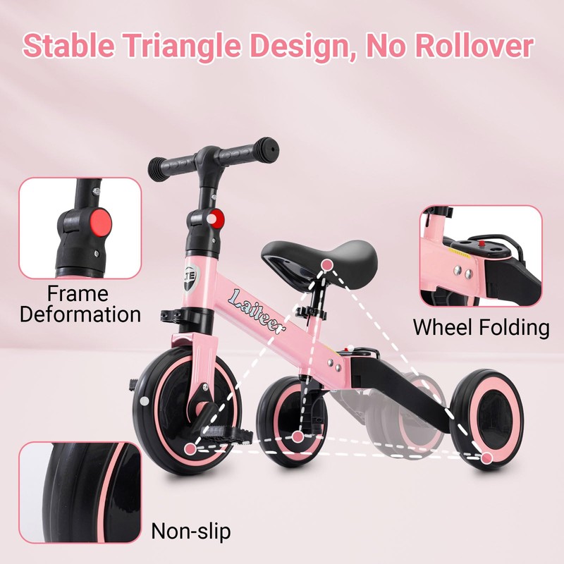3 in 1 Toddler Balance Bike for 2 to 5 Year Old Boys and Girls, Foldable Toddler Tricycle with Training Wheels, Front Footrest, Adjustable Seat & Handlebar, Birthday Gifts and Toys for Baby, Pink