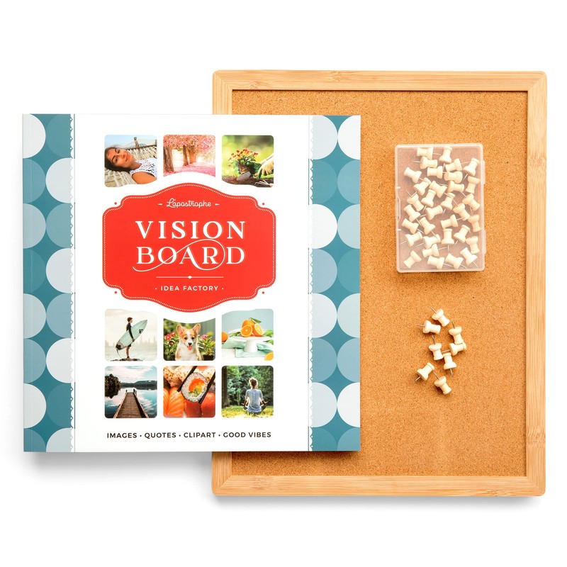 3-in-1 Vision Board Kit - Clip Art Book, Cork Board, Push Pins - A Complete Mood Board Set for Scrapbooking - Collage Journal - Goal Pictures and Quotes - Scrapbook Supplies (by L’Apostrophe)