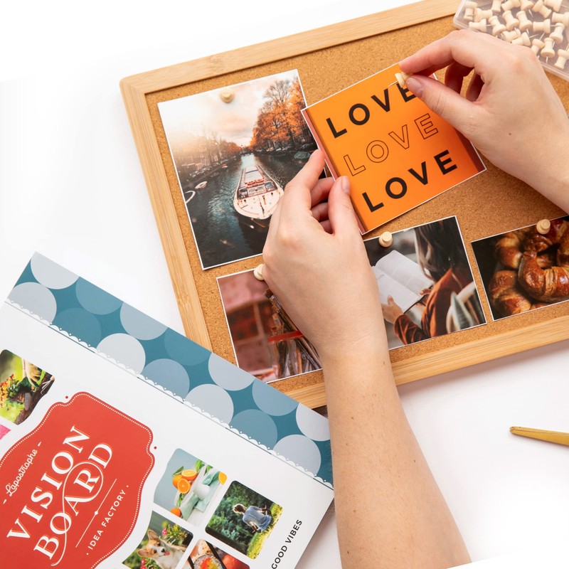 - 3-IN-1: This unique vision board set has it all – a beautiful picture book with inspirational images; a premium cork board; and a boxed set of deluxe wooden push pins.