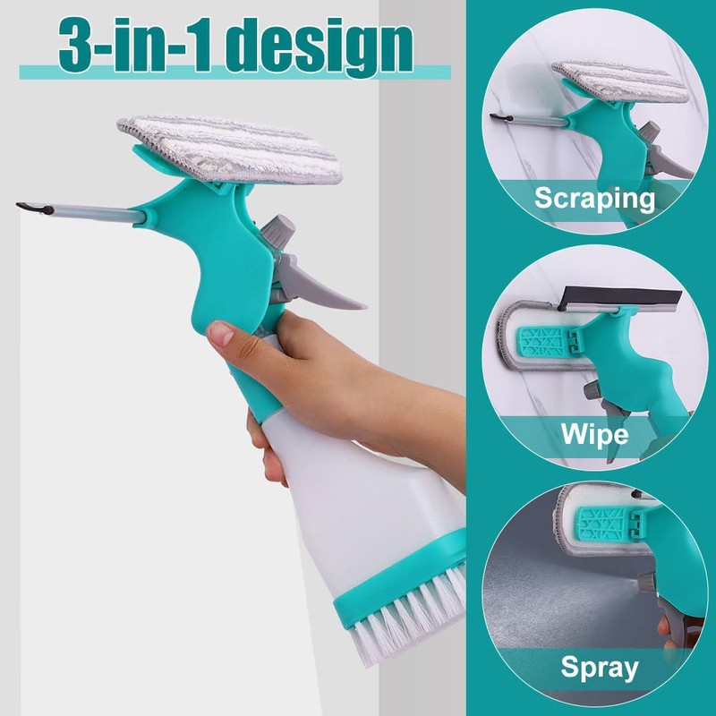 3 in 1 Window Cleaner, Spray Window Squeegee with Spray Bottle & Squeegee & Fabric Washer Head & Brush for Home Car Glass Cleaning