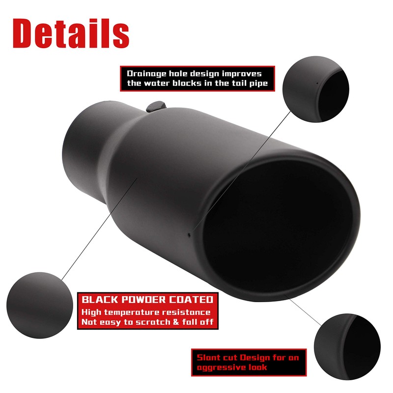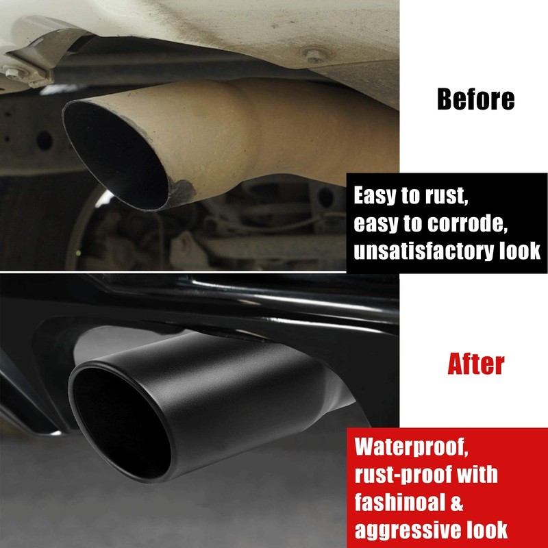 - FEATURES: Exhaust Tip uses film heat sealing packaging to ensure that the product surface will not be scratched during transportation.Durable High Quality Black Powder Coated Stainless Steel With Strong Anti-corrosive to protect the existing tailpipe from corrosion and deformation.