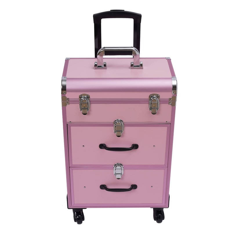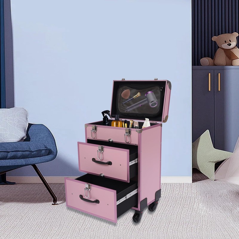 3 Layer Makeup Case, Professional Rolling Makeup Case with Locks, Portable Barber Tools Organizer with Wheels and Retractable Handle, Travel Carry Case with Drawer for Hair Stylist Groomer, Pink