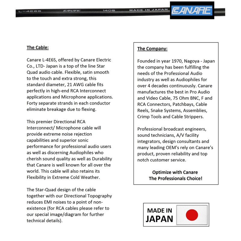 - Based in Nagoya-Japan, Canare manufactures Cables, Tools & Acc. for Pro-Audio/Video applications since 1970. Many Audio-Professionals rely on Canare’s proven reliability, top-notch quality & customer service. Optimize with Canare, the Professionals Choice!